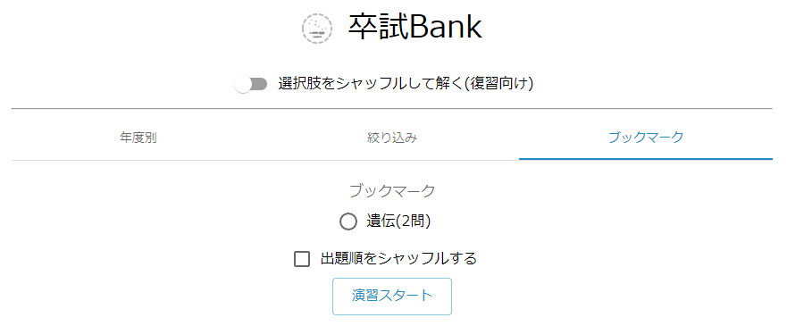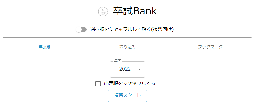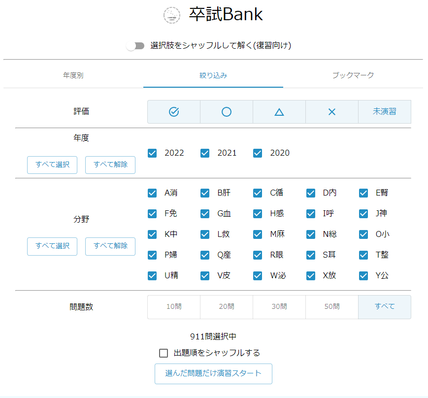 メインです.自己評価,年度,分野を絞り込んで演習できます.