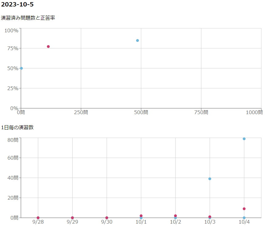 上のグラフは演習数と正答率,下のグラフは1日ごとの演習数を1週間分表示しています.
